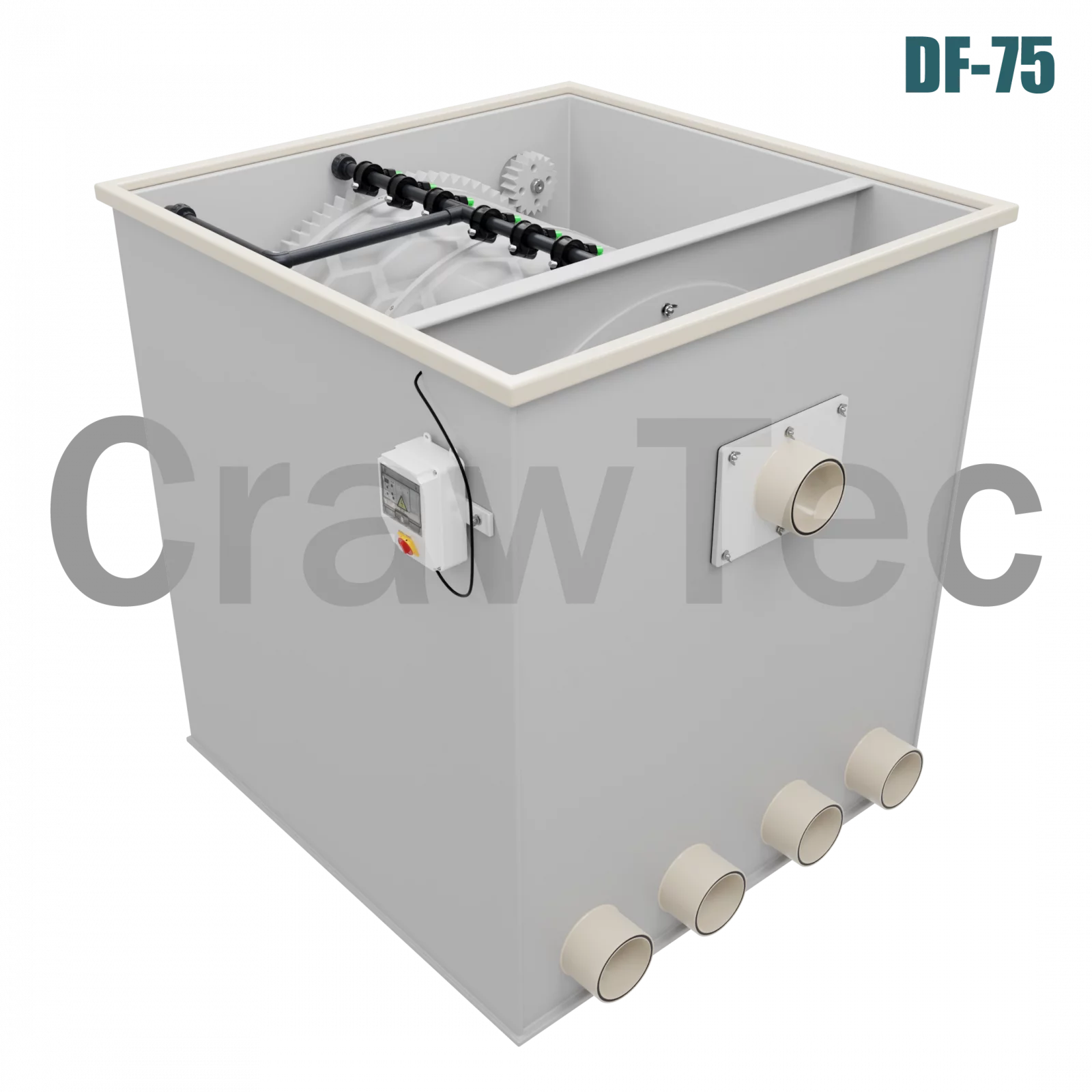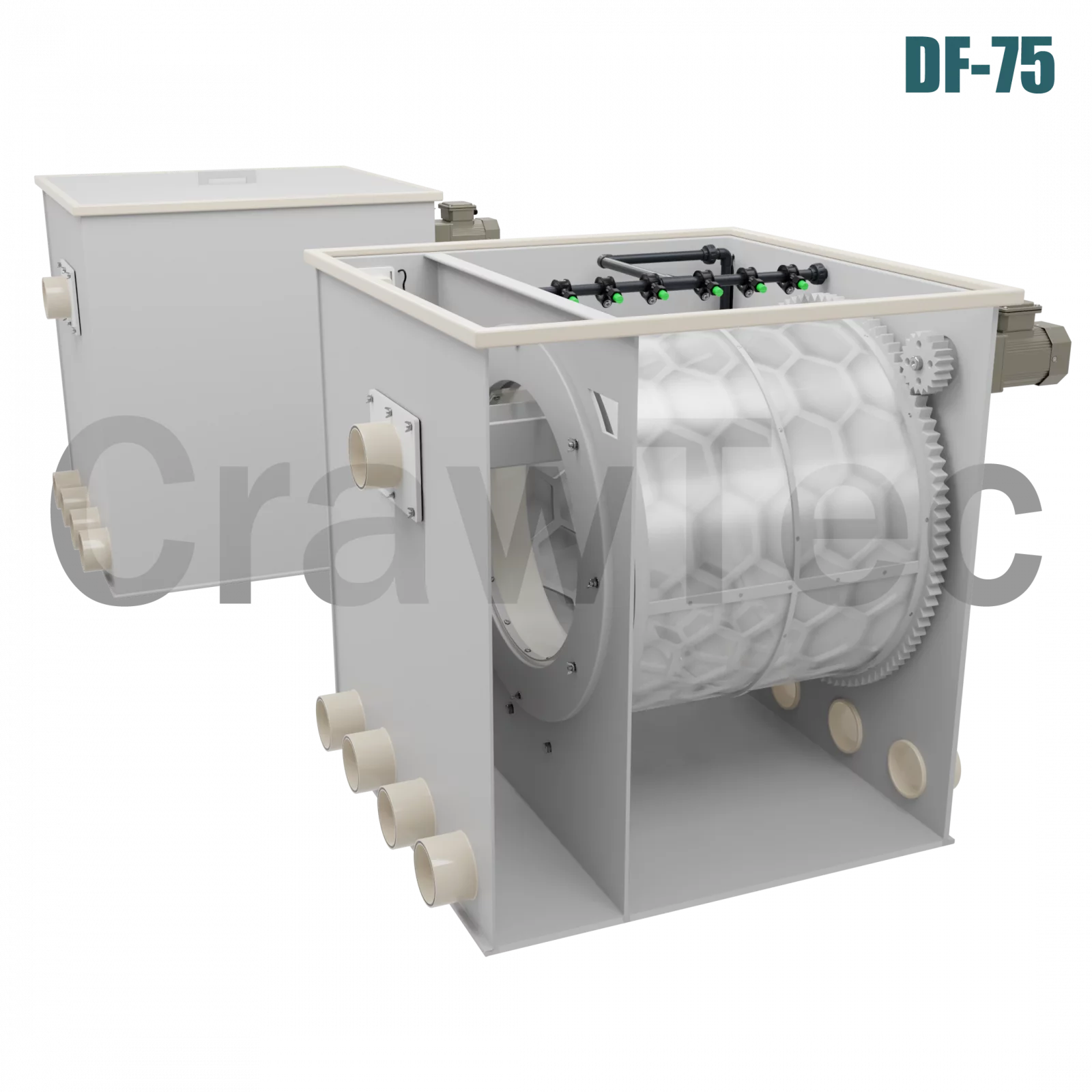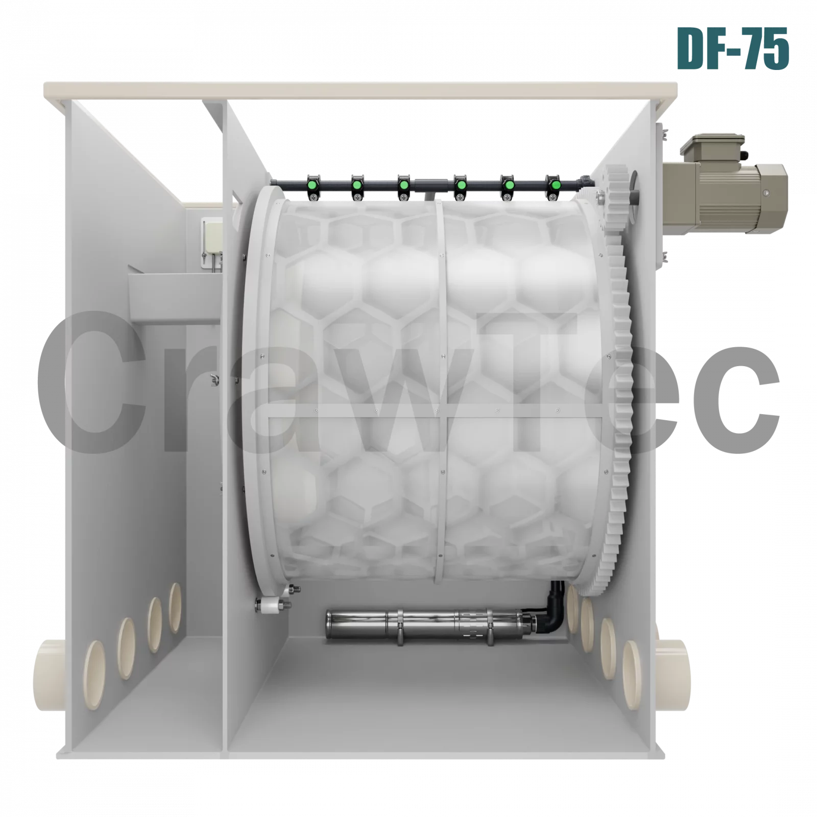 The CrawTec 75 m³ drum filter is a high-capacity mechanical filtration solution designed for intensive aquaculture and closed-circuit water systems. It provides continuous removal of suspended solids and organic contaminants, ensuring stable water quality for fish, shrimp, and crayfish farming.