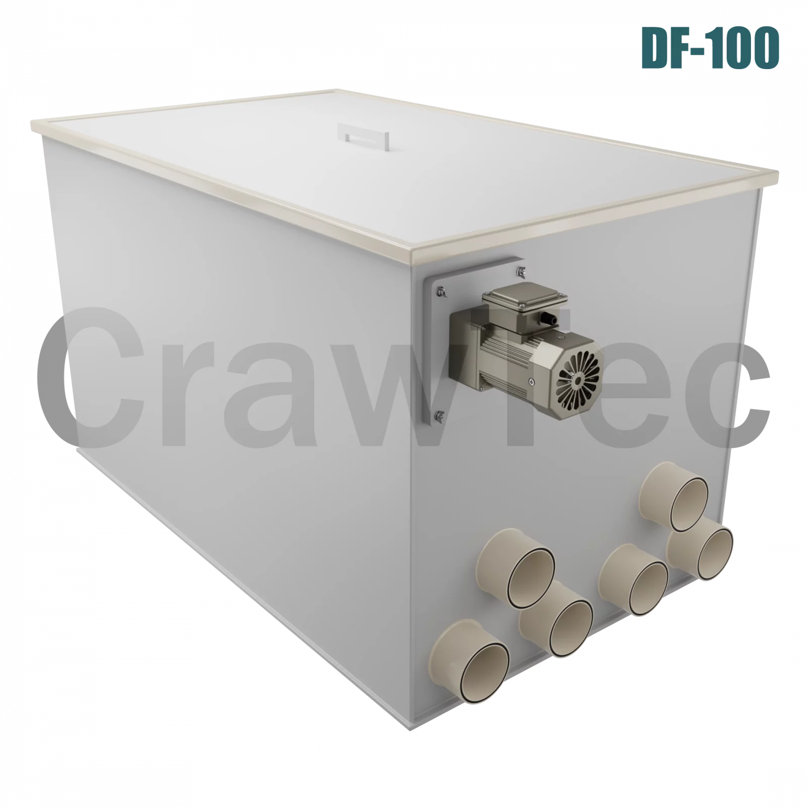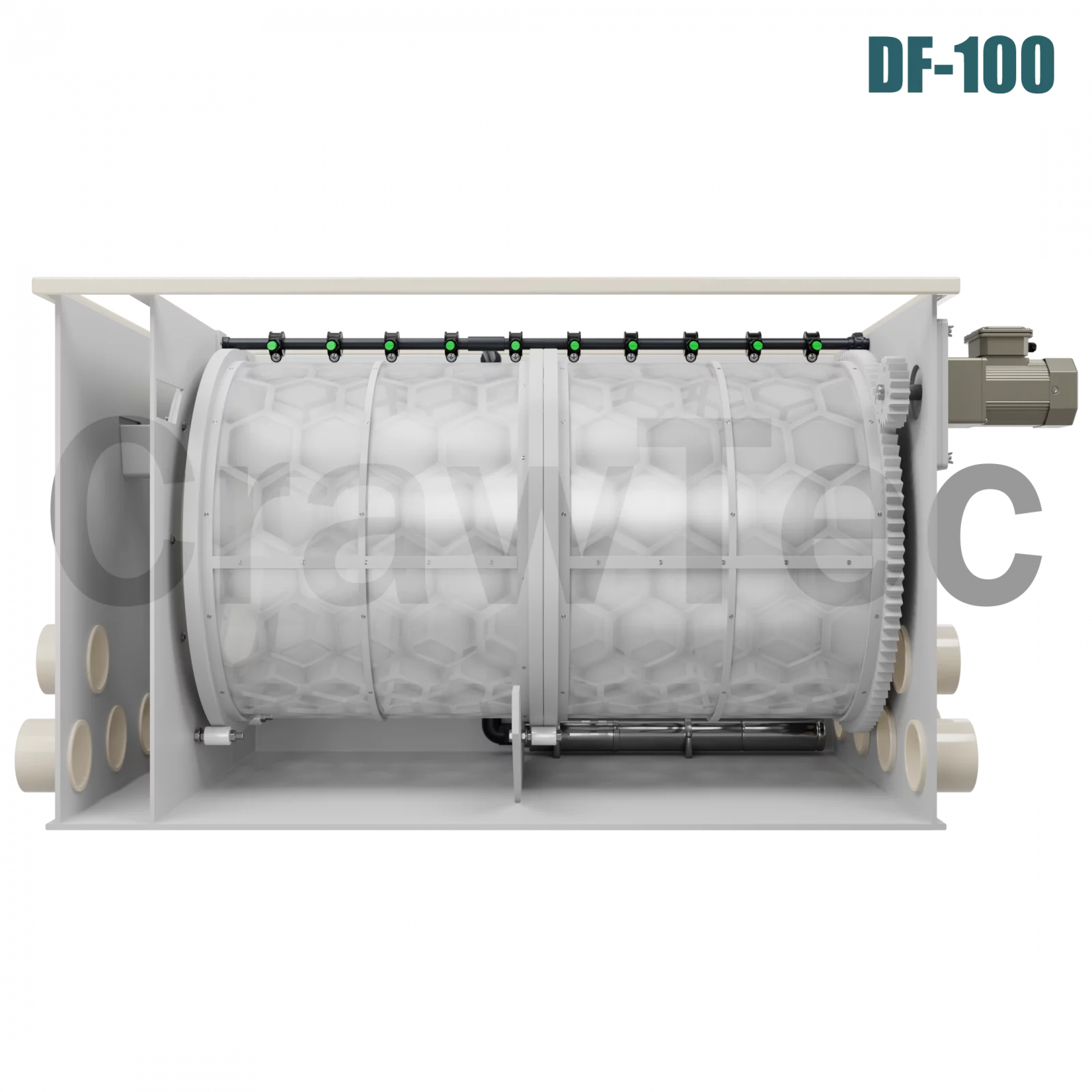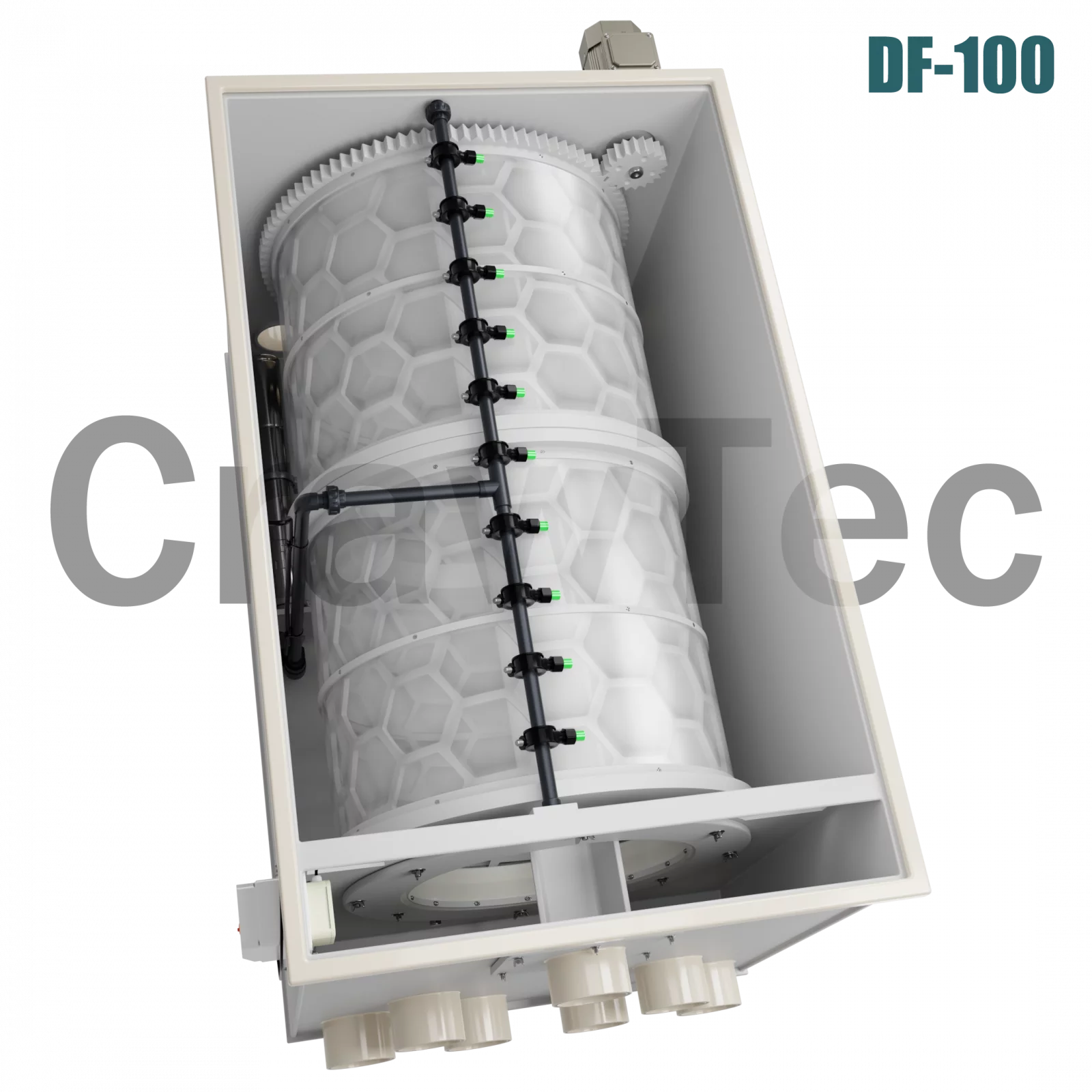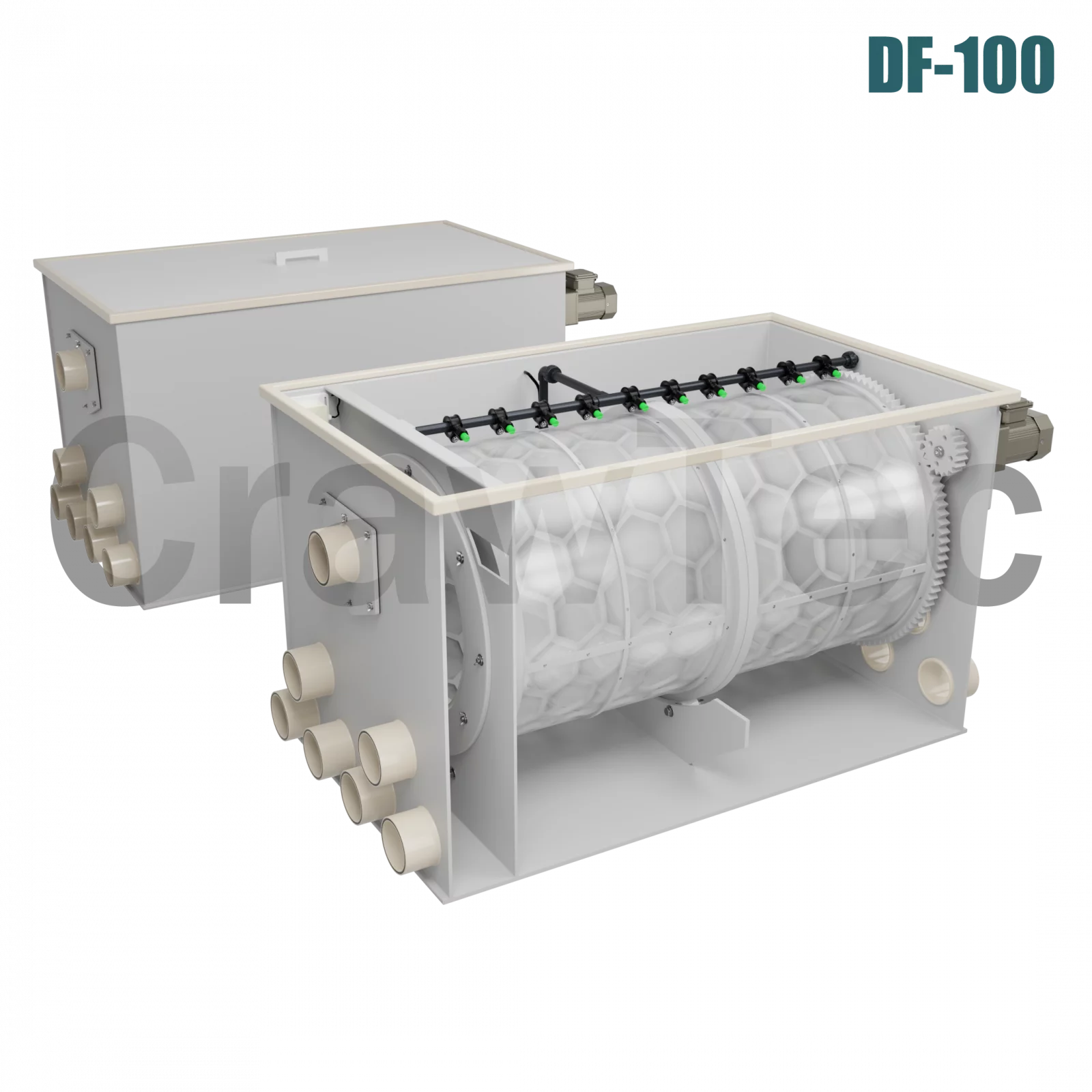The CrawTec DF100 drum filter is a high-capacity mechanical filtration unit designed for large industrial aquaculture operations. It is widely used in shrimp, fish, and crayfish farming, where stable water quality and continuous solid removal are critical for productivity and animal health.