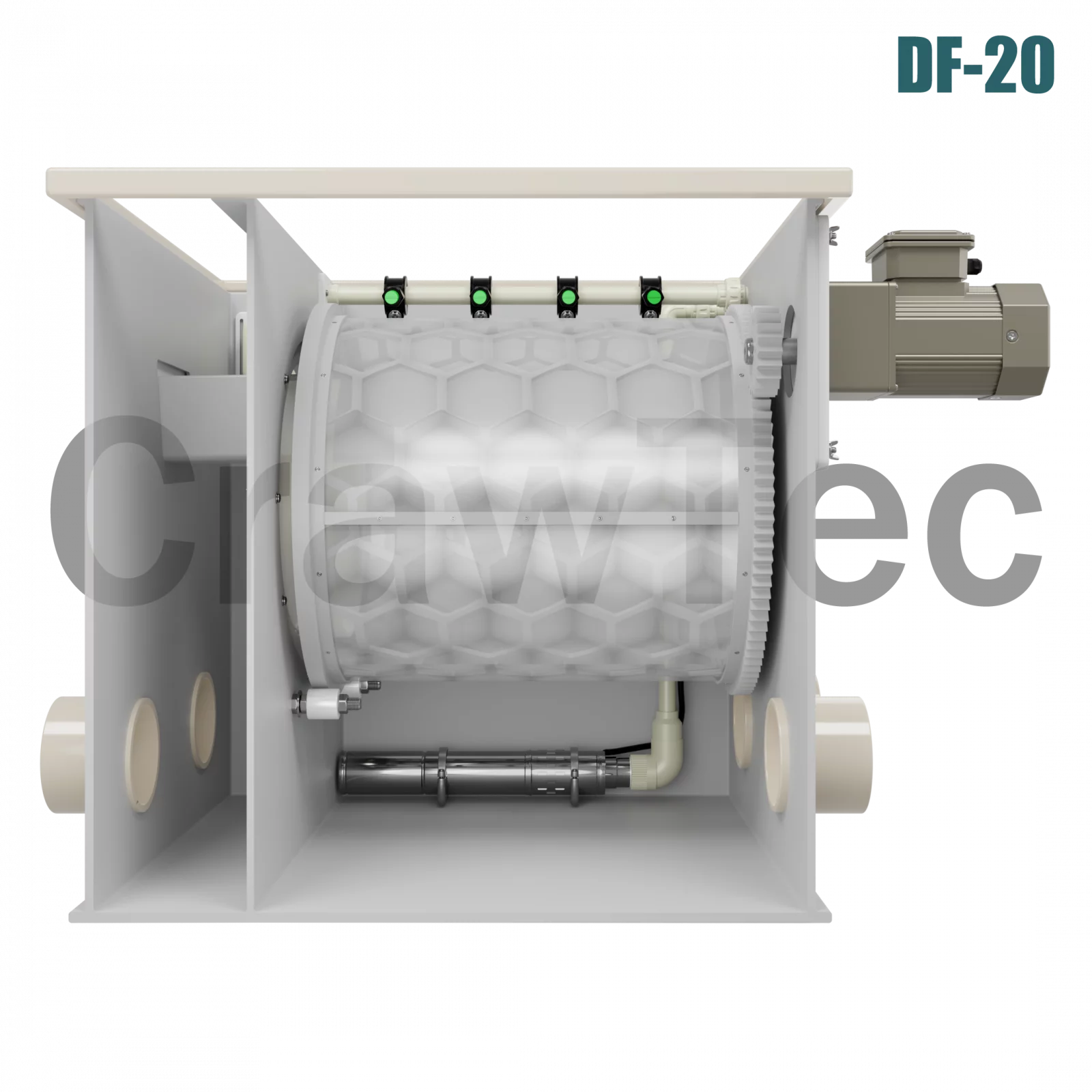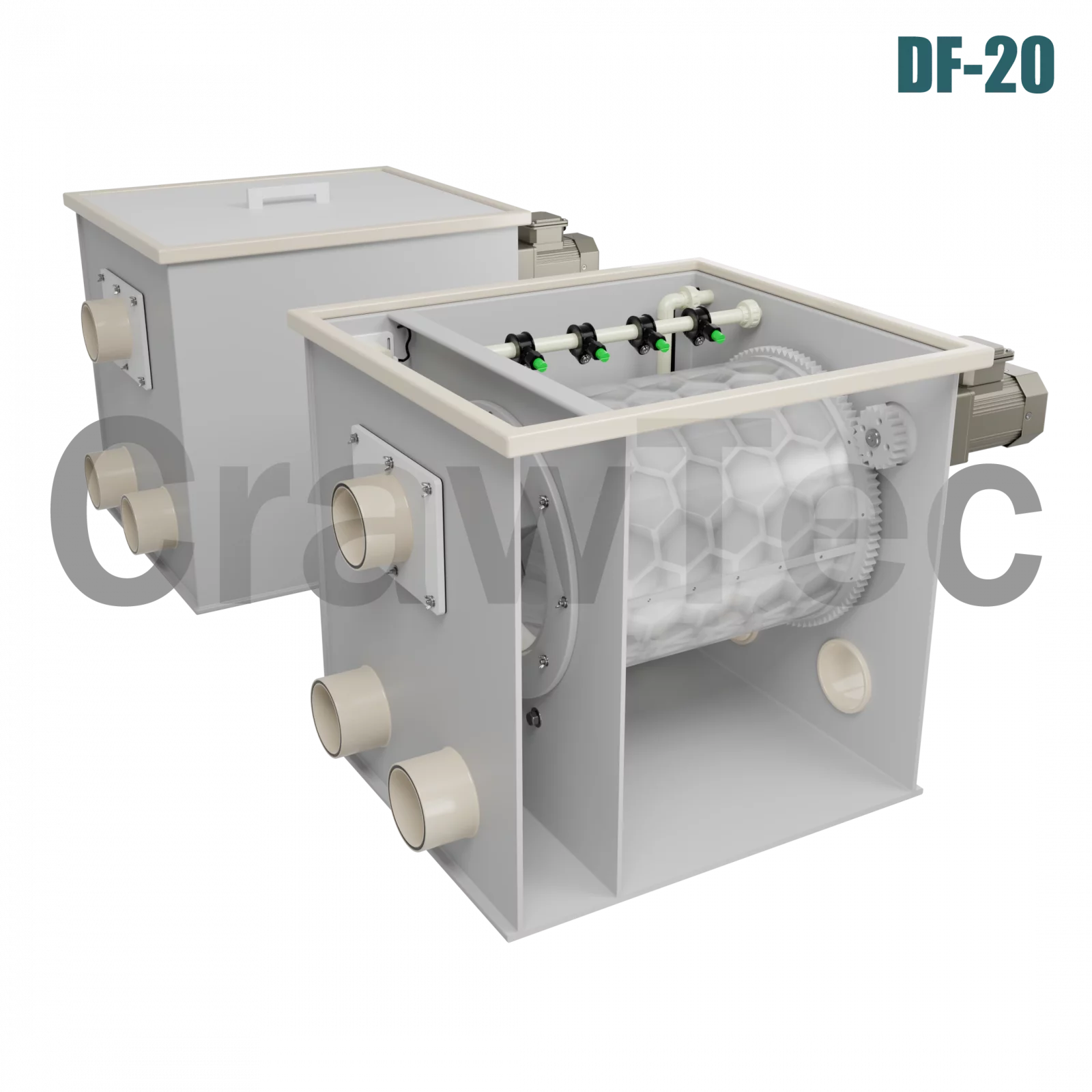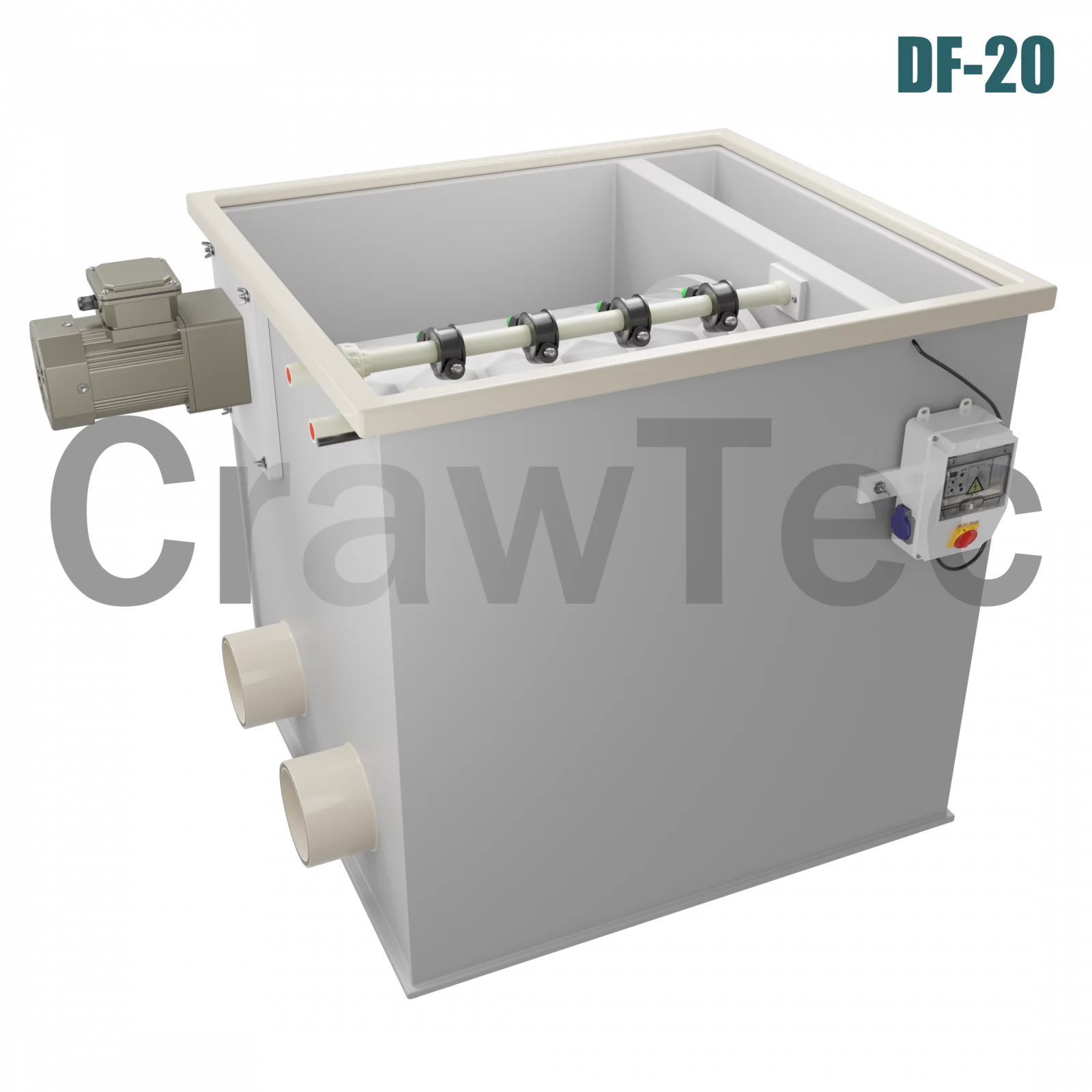 The CrawTec DF20 drum filter is a mechanical filtration unit designed for continuous water treatment in industrial aquaculture systems. It is used in shrimp, fish, and crayfish farming to remove suspended solids and organic particles, supporting stable water quality and healthy growing conditions.