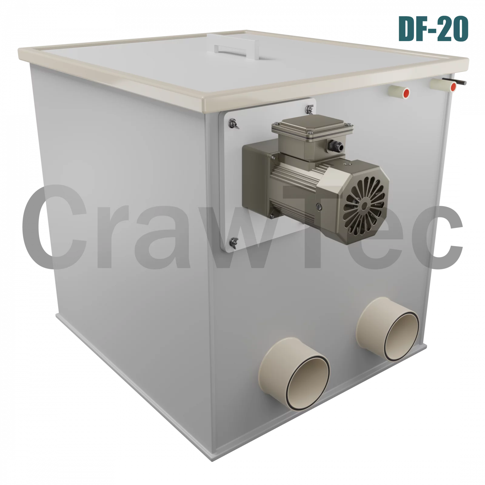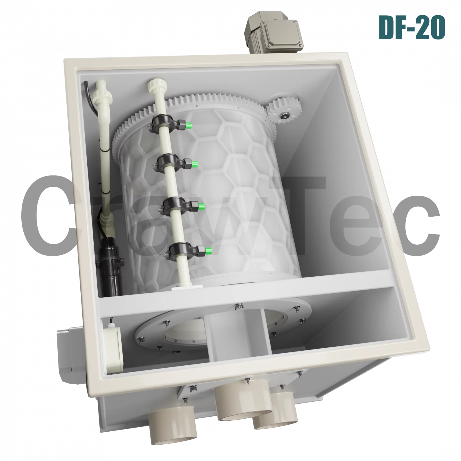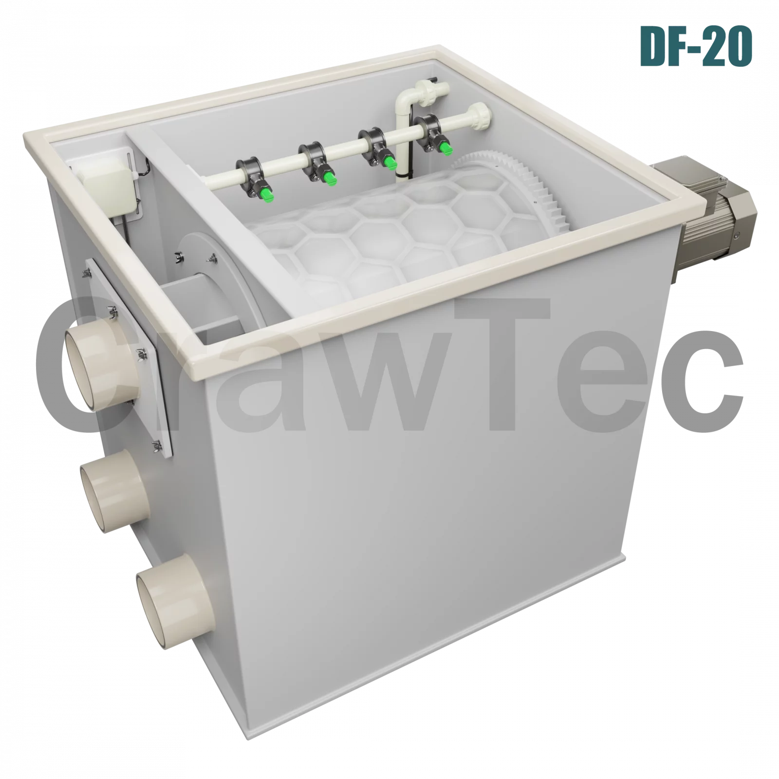 The CrawTec DF20 drum filter is a mechanical filtration unit designed for continuous water treatment in industrial aquaculture systems. It is used in shrimp, fish, and crayfish farming to remove suspended solids and organic particles, supporting stable water quality and healthy growing conditions.