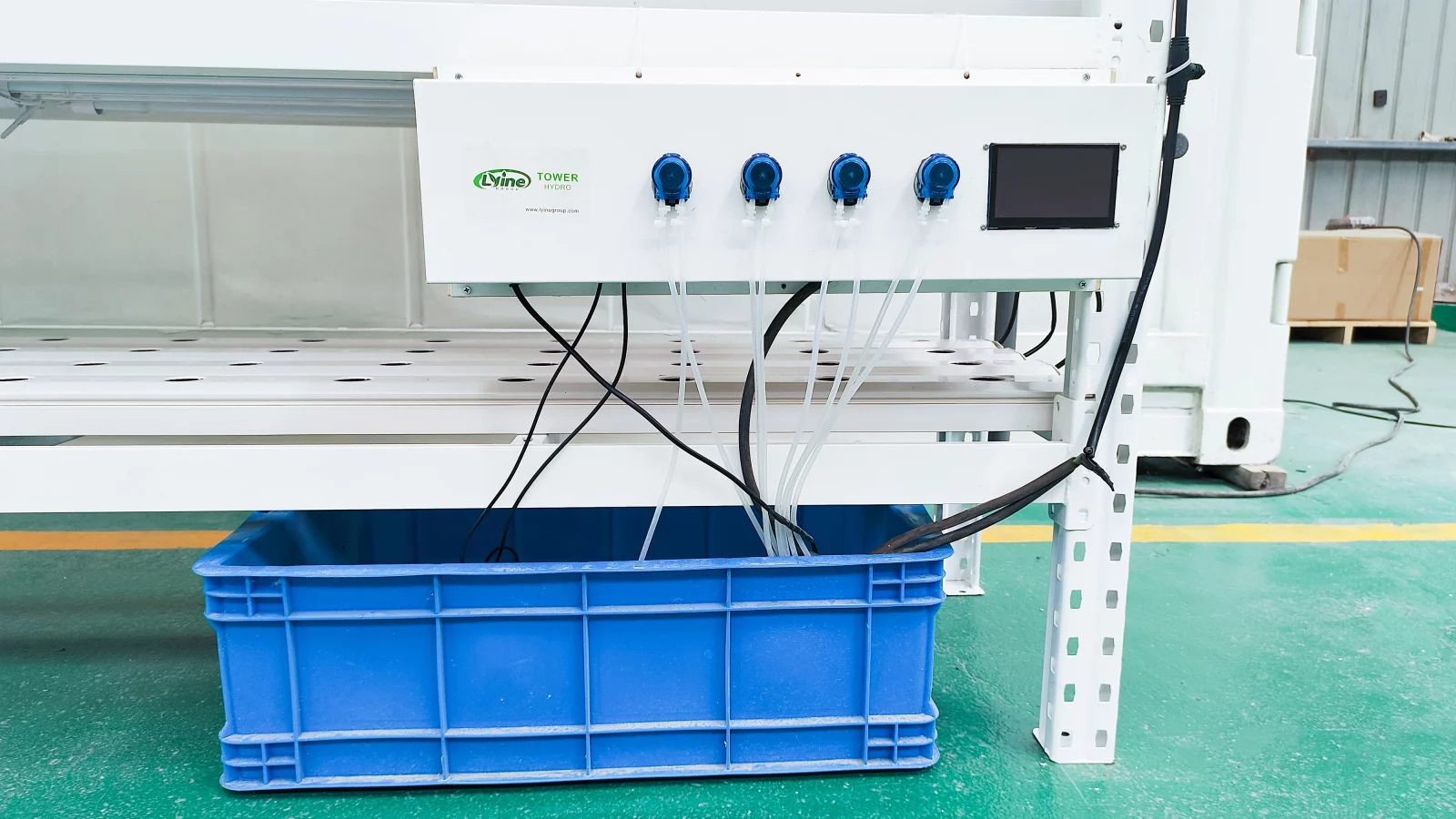 The system includes essential components required for stable and continuous operation. A circulation pump maintains nutrient flow across all channels, while an electronic timer regulates irrigation cycles to ensure proper exposure of roots to the nutrient film.